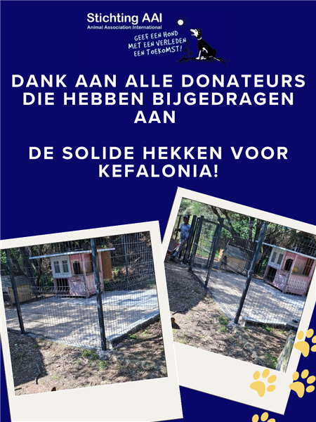 Dankzij jullie betrokkenheid zijn er inmiddels veilige en stevige hekwerken geplaatst. De honden hebben nu meer ruimte om vrij te bewegen, te spelen en tot rust te komen. Ook zijn noodzakelijke reparaties aan de hokken uitgevoerd. In deze link naar een schattige puppy-video Hekken voor Kefalonia en foto’s hieronder is het resultaat te zien: een solide omheining én blije honden die zichtbaar genieten van hun nieuwe, veilige omgeving.