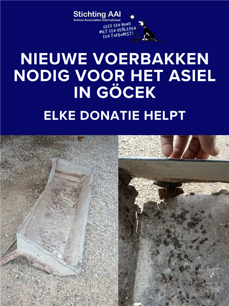 Het grote asiel waar dagelijks voor veel honden wordt gezorgd, kampt met een ernstig probleem: de huidige voerbakken en voervoorzieningen zijn sterk verouderd, verroest en beginnen uit elkaar te vallen. Hierdoor komen er kleine steentjes tussen het voer terecht, die door de honden worden ingeslikt. Dit leidt tot ernstige gezondheidsproblemen, zoals darmverstoppingen, maagkantelingen en zware diarree – met soms zelfs fatale gevolgen.
