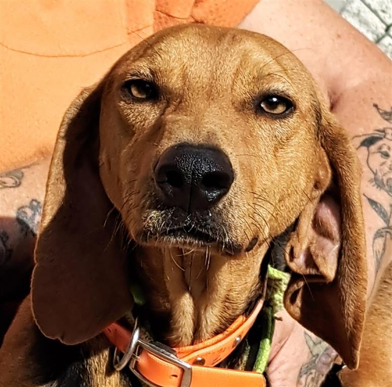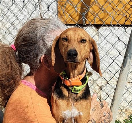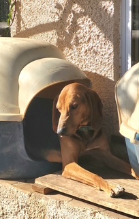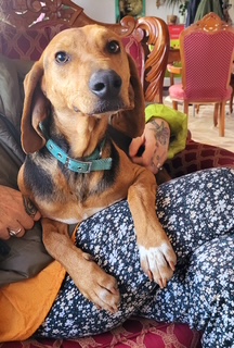 zijn kennel liggen of in huis in een mand. Hij is gek op aandacht en knuffels.