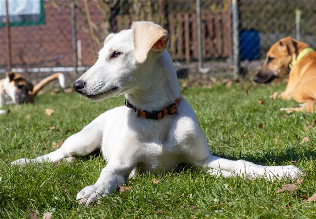 Blue is de meest onafhankelijke en kalme van de hele roedel. Ze speelt en stoeit met haar zusjes, maar niet te lang, want ze houdt van haar eigen ruimte en rust. Dan zoekt ze lekker haar eigen plekje. Ze houdt van knuffelen en is erg behendig .De bench blijft ’s nachts meestal schoon en overdag doet ze haar behoefte buiten als je er op tijd bij bent.. Ze loopt netjes aan de lijn en trekt niet. Ze is erg vriendelijk met andere honden en is dol op het achtervolgen van vogels. We zijn helemaal verliefd op haar en weten dat haar persoonlijkheid zal stralen bij haar toekomstige gezin. Ze is de allerliefste.