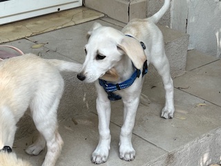 Een bevriende dierenarts heeft AAI gevraagd te helpen een goed tehuis te vinden voor een viertal pups, waaronder Blue. Deze pups zijn met hun moeder gevonden in de woestijn en komen half maart naar Nederland. De eerste weken van hun leven hebben ze in de woestijn geleefd, de moeder had een hol gemaakt achter ondoordringbare struiken, dus niemand kon ze pakken. De moederhond is ongeveer 13 kg, een slank hondje (zie foto). Ze is duidelijk wel van iemand geweest, want ze was al direct zindelijk en heel vriendelijk tegen de kinderen van het gastgezin waar ze opgenomen is. De moeder mag daar ook blijven. In de woestijn liepen een paar reuen rond, het is niet duidelijk wie de vader was. De eindgewichten zijn dus inschattingen, gebaseerd op het huidige gewicht van de pups.