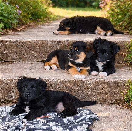 Een klein hondje van een herder kreeg 6 puppy’s. De herder gaf 1 puppy weg en zocht voor de andere puppy’s ook een nieuw adres.