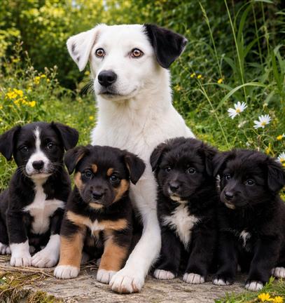 Een klein hondje van een herder kreeg 6 puppy’s. De herder gaf 1 puppy weg en zocht voor de andere puppy’s ook een nieuw adres.